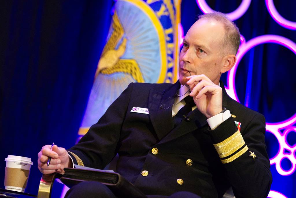 U.S. Navy Rear Adm. Doug Small, the leader of both Project Overmatch and Naval Information Warfare Systems Command, listens to a question at the Sea-Air-Space conference in National Harbor, Maryland, on April 4, 2023.